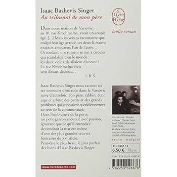 Au tribunal de mon père, par Isaac Bashevis Singer. Souvenirs d'enfance de l'écrivain juif polonais qui a écrit la plupart de ses livres en yiddish, pourtant une langue essentiellement orale. le jeune narrateur habite au 10, rue Krochmalna à Varsovie, au début du XXe siècle.Le plus souvent, il s'agit d'histoires centrées sur le rituel, l'observance : peut-on manger une viande tombée par mégarde dans une casserole où bout du lait (selon la Loi, on ne doit pas faire cuire l'agneau dans le lait de sa mere, soit ne pas mélanger viande et laitage dans le même repas) ? Comment une mere peut-elle accepter que son fils qui s'est suicidé soit enterré de façon indigne et non comme tout le monde ? Que faire face à une femme qui prête serment sur les rouleaux de la Torah (suprême blasphème en soi, déjà), et prétend dire la vérité alors qu'elle finit par avouer qu'elle ment et voudrait se repentir ? Un homme qui vit misérablement dans une cave, peut-il dormir à côté de sa femme morte, pour ne pas coucher à terre au milieu des rats, l'inhumation ayant lieu le lendemain ? Est-il permis d'épouser une prostituée si on l'aime ? Voilà le genre de questions auxquelles le rabbin doit trouver des réponses inspirées par sa grande connaissance des textes sacrés.Ce livre a l'apparence d'un recueil de nouvelles, mais c'est seulement une apprence. Il y a une grande continuité, il s'étale dans le temps et nous, invités dans toutes les règles de l'art, nous sommes happés, nous nous sentons là comme entrés par effraction, malgré toute cette humanité ainsi déployée. Ce livre est surtout un régal en termes d'observation subtile d'un monde à la fois archaïque et riche de sa culture, où les références au Livre côtoient des croyances païennes, aux dybbouk (démons), au Mal, aux cataclysmes, et où chacun se livre avec passion et souvent dans la démesure.Ce sont des Juifs comme lui qui ont été traînés dans les camps de la mort. Puisse ce livre de souvenirs lui servir de monument, à lui et à ses semblables, qui vécurent saintement et moururent en martyrs."